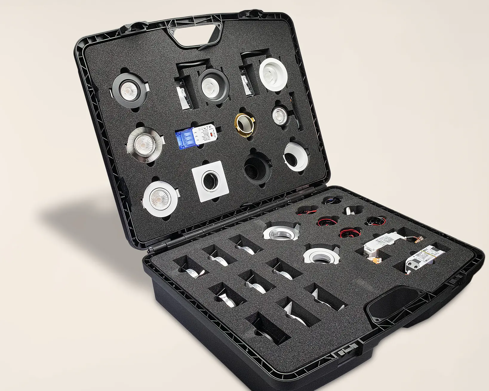 - Wirtschaftlichkeit & Mehrwert: Der Koffer enthält hochwertige Einbauleuchten für jedes Budget – von preiswert bis premium. So können Sie flexibel auf Kundenwünsche eingehen und stets die optimale Lösung anbieten.